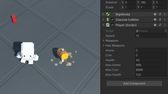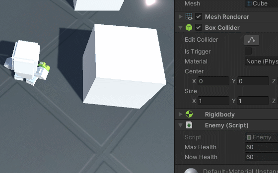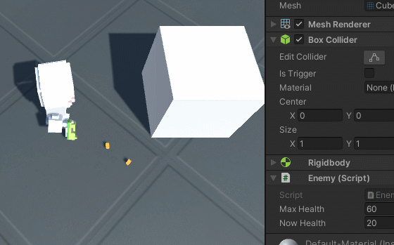 물체의 Health(체력)이 0이 되면 랜덤한 위치로 넉백되며 회색으로 색상이 변경된 후 사라집니다.