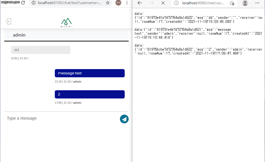 채팅방으로 들어가서 확인해보면 다음과 같이 데이터들을 불러옴을 알 수 있습니다. 이를 서버A에서 정제하여 출력하는 것입니다.