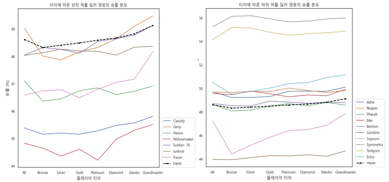 픽률을 기반으로 하여, 양쪽으로 분류하여 그래프를 작성했고 승률을 보여주었다.