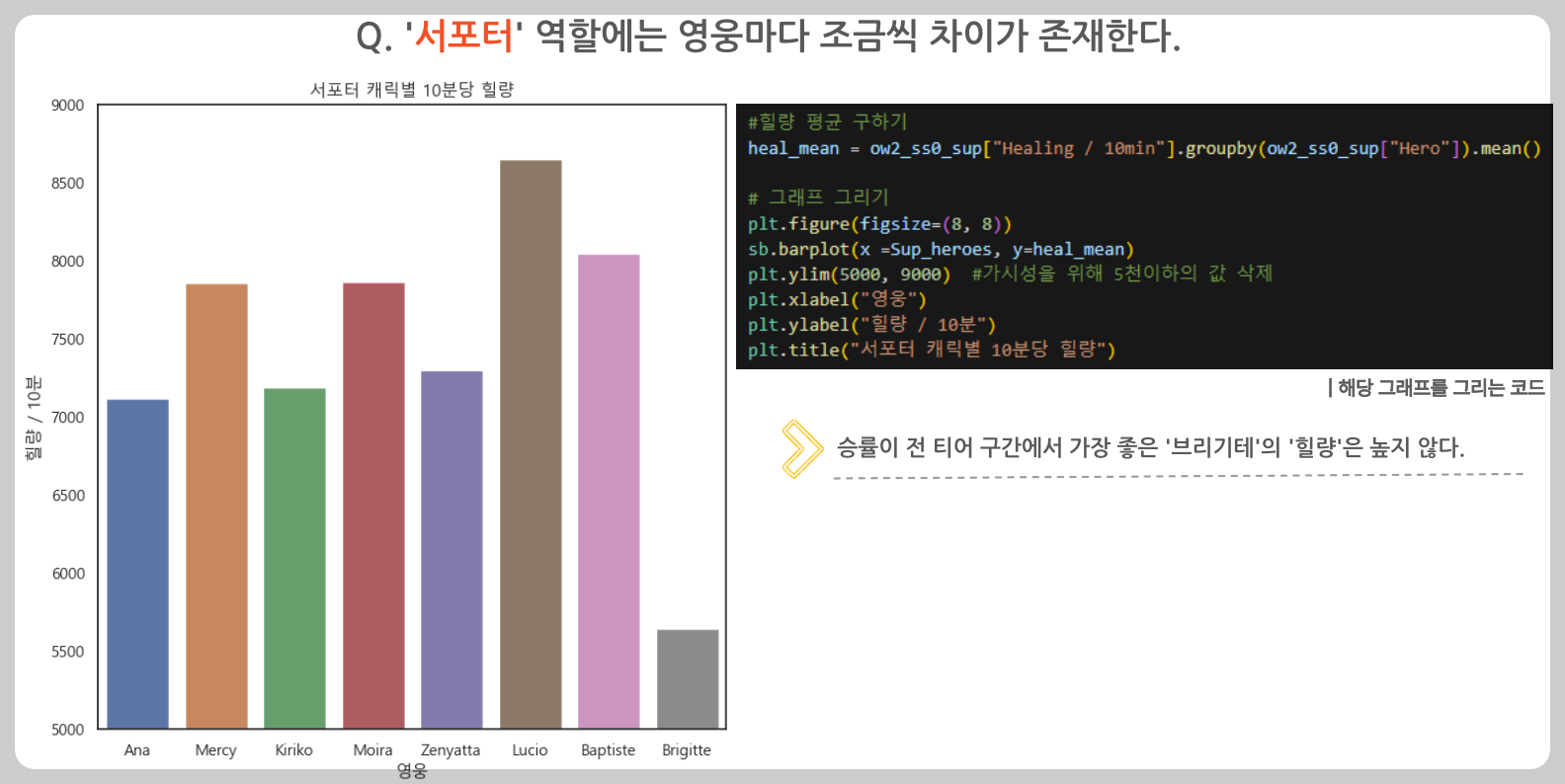 그렇기 때문에 서포터 역할군의 힐량을 모두 나타내었고 이를 가시성이 좋은 barplot 을 사용하여 나타냈다.