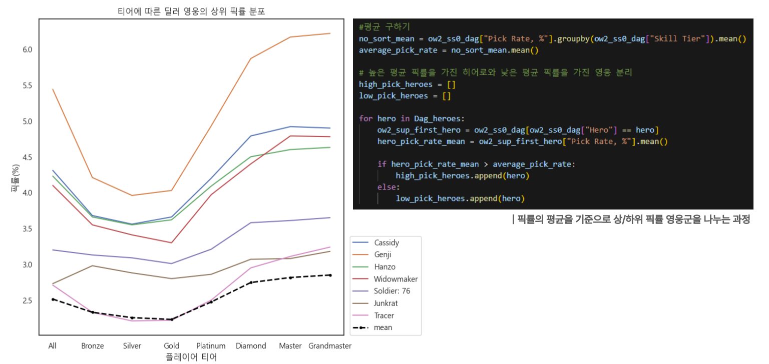 픽률을 기반으로 하여 픽률의 평균보다 높고 낮음을 기준으로 영웅 군들을 분류하여 데이터를 분석하였다.