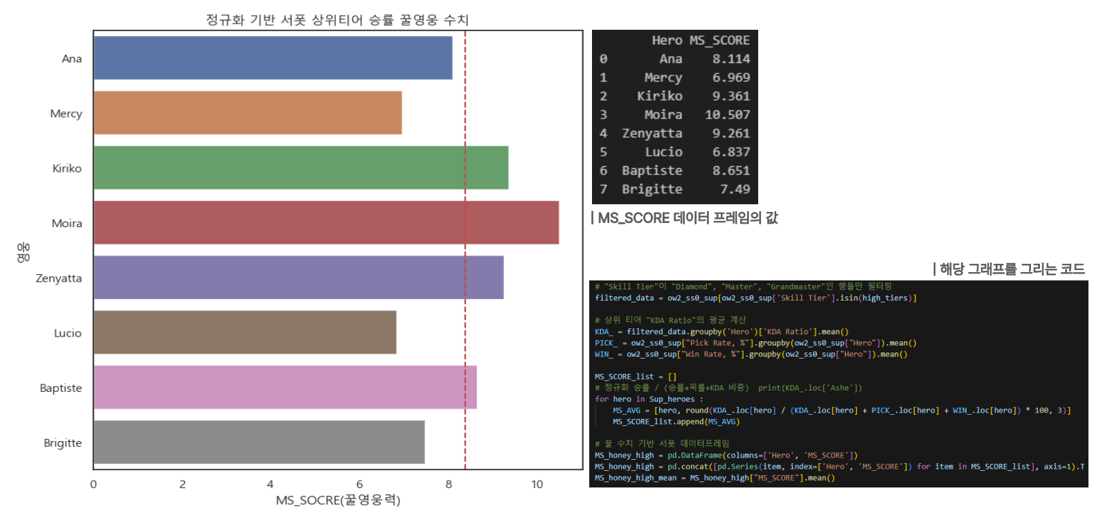 정규화 공식을 자체적으로 수립 및 적용하여 영웅 군, 포지션 별 분석을 진행했다.