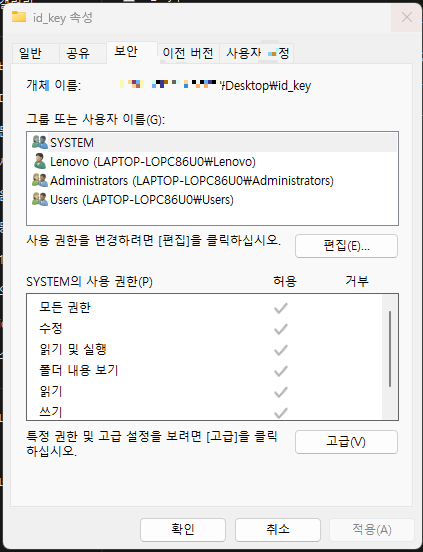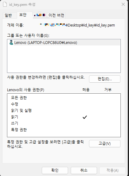 윈도우10에서 SSH 접속 시 pem 파일 권한변경